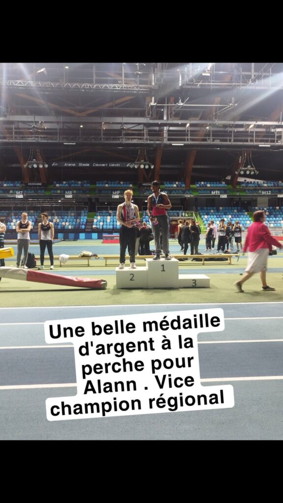 L’autre athlète qui monte, on commence à bien le connaître Alann Marcinkowski. Podium, oui 2ème en perche cadet régionale. Car il s’agissait aussi pour les cadets jusqu’aux seniors des championnats régionaux. Mais là aussi le plus important est dans la performance (ou plutôt les performances). En perche il a effacé 3 m 80, record personnel et ce avec une toute nouvelle perche arrivée quelques jours avant. Perche qui va peut être déjà s’avérer trop faible s’il passe 4 m dans quelques temps. Quand on connait le prix des perches (pas loin de 1000 euros) on se doute de toute la difficulté du club à suivre avec efficacité une telle discipline. Et quand on sait que le club n’a pas d’installation de perche on mesure encore une fois le travail accompli (et le casse tête) des entraineurs du club pour un athlète qui se présente régulièrement sur 10 disciplines différentes, dont les lancers longs pour lesquels là aussi les terrains manquent. Et ce n’est pas fini puisqu’Alann se permet d’aligner un excellent 7″41 en finale du 60 m , à 9 petits centièmes du record du club cadet détenu par un certain … Guillaume Brunez, et quand on sait ce que Guillaume a fait au niveau national dans les années 2000… !