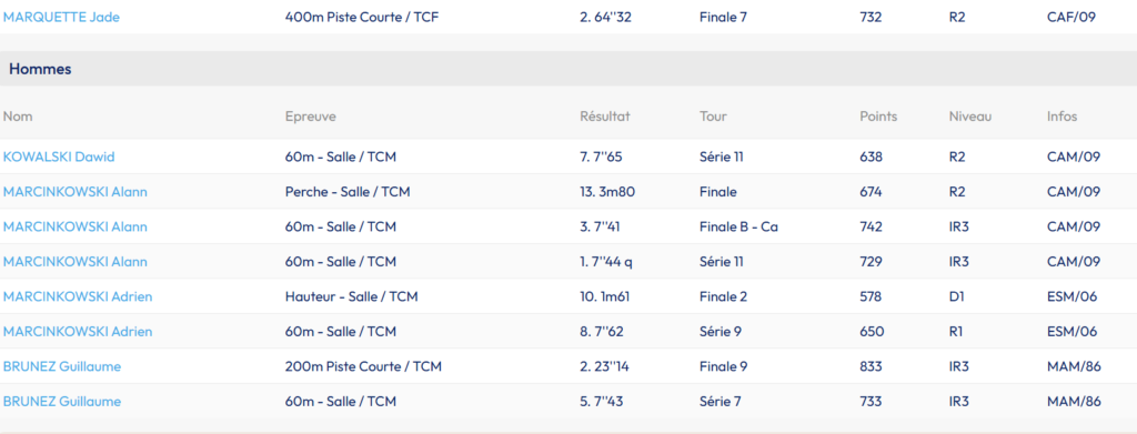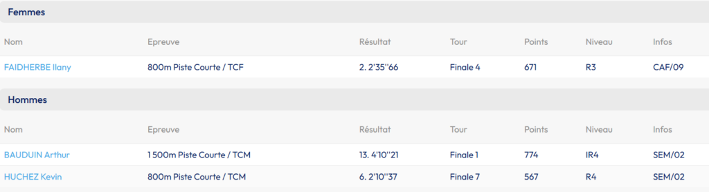 Et il n’y a pas que ces deux là : Commençons par Ilany Faidherbe, cadette, qui s’offre un record personnel sur 800 m en 2’35”, du jeune senior Arthur Bauduin qui continue d’apprendre sur 1500 m et s’offre un joli 4’10” tout comme Kevin Huchez lui aussi qualifié pour ce championnat en 2’10 au 800 m. Pour les sprinters Jade Marquette, cadette, améliore aussi son record sur 400 m avec 64″32 et se positionne comme une athlète d’avenir pour le club, tout comme l’autre cadet Dawid Kowalski qui progresse sans avoir su bousculer les choses sur cette course de 60 m. Adrien Marcinkowski et Guillaume Brunez complétaient les qualifiés et on tenu leurs rangs avec des performances égales à ce qu’il savent faire. Les résultats complets ci dessous