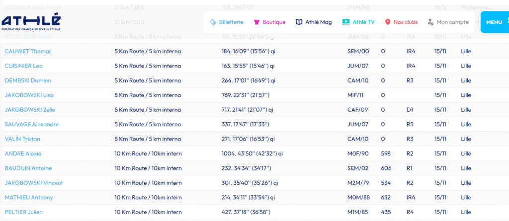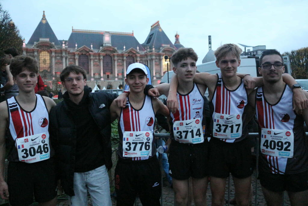 Sur les 13 engagés aux 5 et 10 km de Lille, 9 se sont qualifiés pour soit le championnat de France du 5 km (6 athlètes) ou le 10 km (3 athlètes) . Et dans les 13 il y avait une minimes non qualifiable. C’est donc un pourcentage de 75% de réussite obtenu par le club. le meilleur temps sur 5 km est à mettre à l’actif de Kamil Boukhriss avec 15’44” qui du coup reprend aussi le record club junior à Léo qui lui termine juste derrière en 15’46” – la bataille n’a pas fini entre ces deux là ce qui ne peut être que bénéfique pour tout le monde. Pour les cadets les deux protagonistes Damiens Dembski et Tristan Valin se tiennent aussi foulée dans foulée avec respectivement 16’49” et 16’53”. Une seule cadette sur la course Zelie Jakobowski qui se qualifie aussi en 21’07”. Se qualifient aussi Thomas Cauwet en senior avec 15’56”. Dans le 10 km sa compagne Alexia André termine en 42’32” alors que les masters Anthony Mathieu et Vincent Jakobowski finissent en 33’54” et 35’26”.