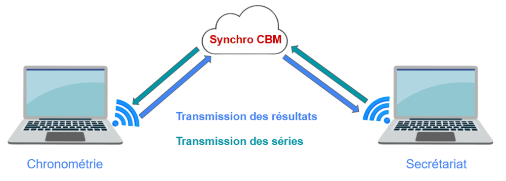 Synchro CBM est destiné au site dont la configuration impose d’affecter une personne à la navette des feuilles de résultat, en raison de l’éloignement du secrétariat et de la chronométrie électrique, mais aussi des contraintes matérielles pour les relier en réseau.