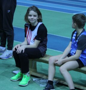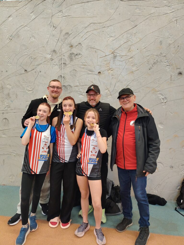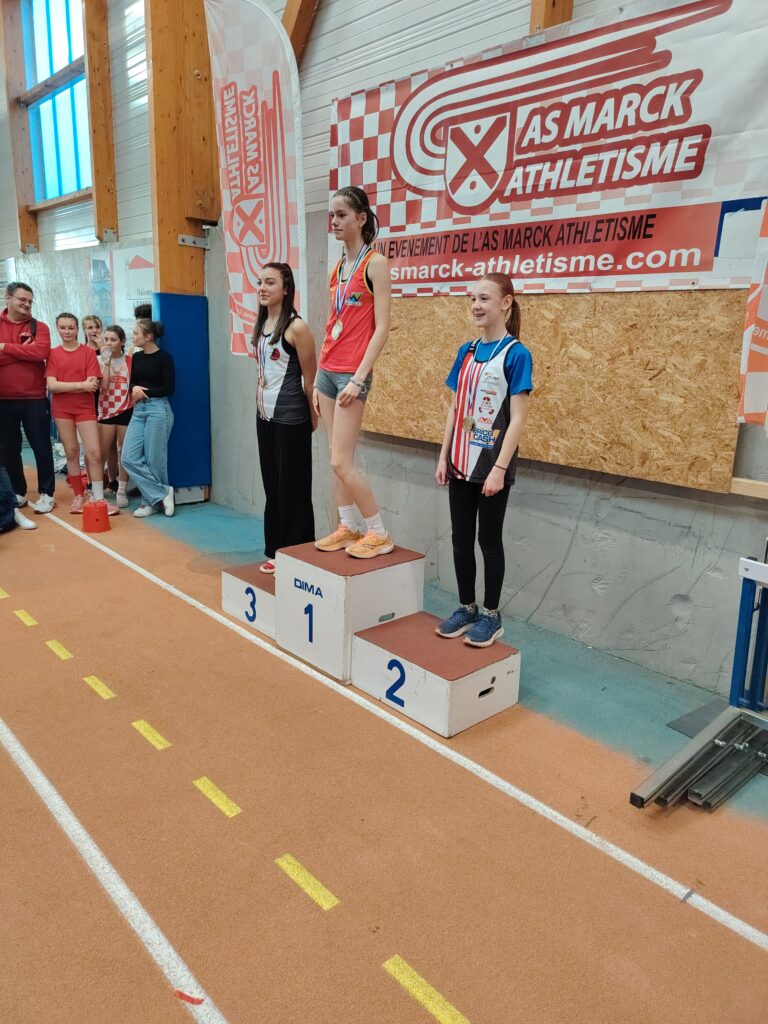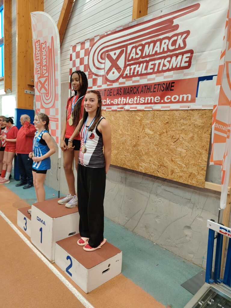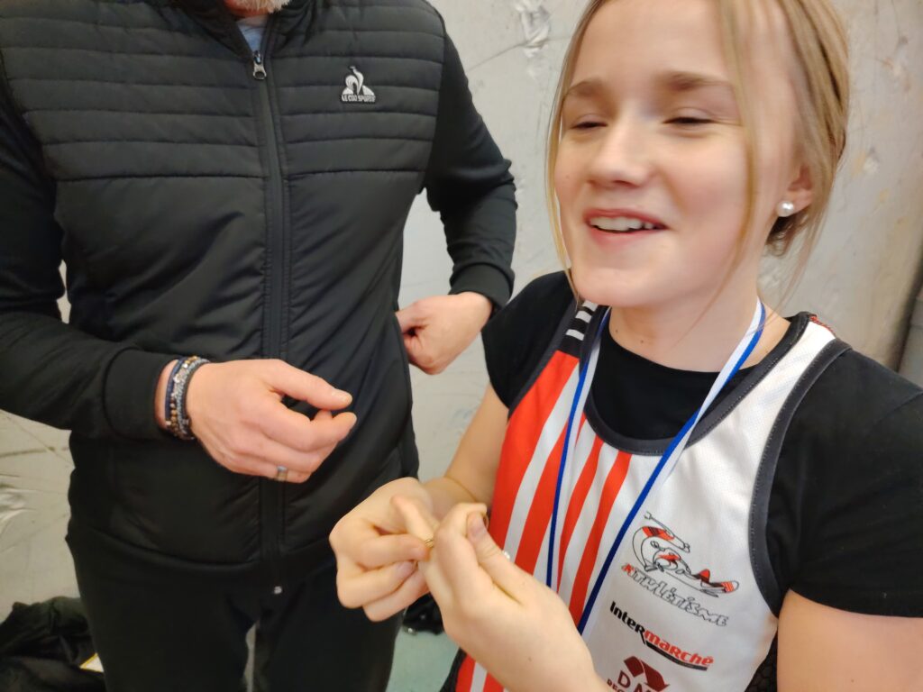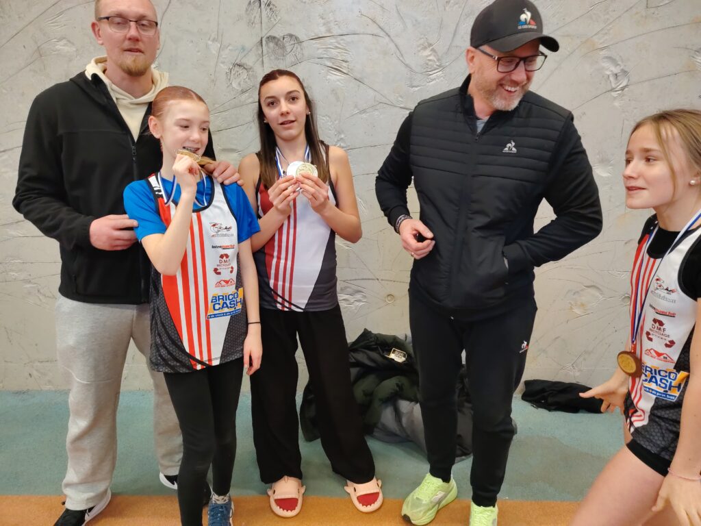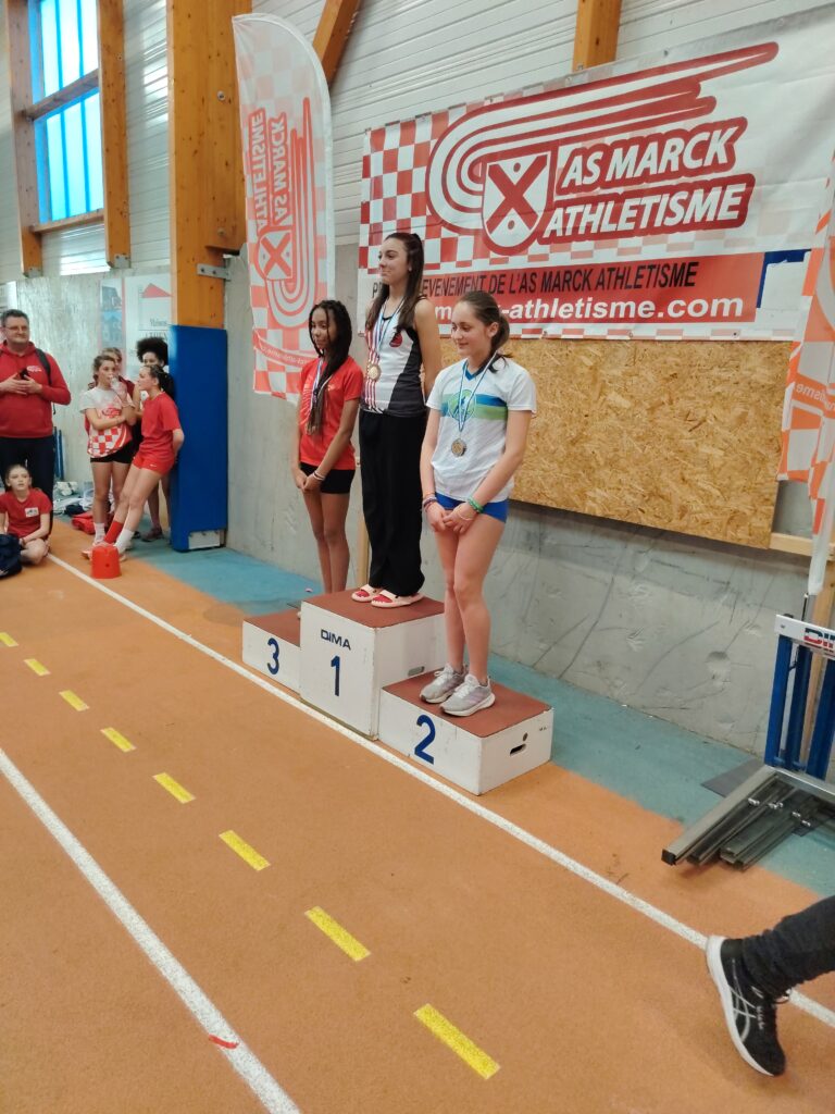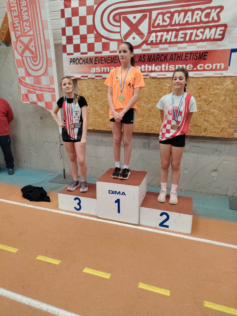 Quand nos benjamins sont motivés, les performances sont là. Et quand les perfs sont là les records tombent et avec les records les médailles. C’était tout simplement la fête à la médaille samedi à Marck en Calaisis pour le championnat départemental des benjamin(e)s, dernière compétition individuelle officielle de l’hiver pour cette catégorie (et plus haut niveau de compétition aussi, car il n’y a pas en hiver de championnat régional pour eux). Cinq médailles dont un titre, avec de très belles surprises. Si on attendait le titre départemental au lancer de poids pour Meliana Ringot, au vu de toute sa saison hivernale ou elle a dominé les débats, on attendait moins cette belle performance de 10m33 et ce nouveau record du club. On l’espérait aussi sur le podium du triathlon (3 épreuves) et ce fut fait avec cette belle 2ème place et ce beau score de 112 points acquis grâce à un saut en longueur à 4m30 (RP) une 3ème place sur cette épreuve et une place en finale au 50 m dans lequel elle prend la 6ème place. 3 médailles donc pour la jeune Meliana et une saison réussie. On espérait Lisa Marcinkowski aux haies, et même si elle a fait une finale dans laquelle elle termine 5ème, c’est en longueur qu’elle s’est distinguée, et là on l’attendait moins, avec un bond réussi à 4m31; Ce qui lui a offert une jolie médaille d’argent, et nous a offert à nous CBM 2 athlètes sur le même podium de longueur. A noter aussi que Lisa passe la barre des 100 points en triathlon (102 pts) et prend la 5ème place du département. Vous aurez compris que cela nous mettait 2 filles dans les 5 premières au niveau du département en triathlon. 4 médailles donc pour ces 2 filles qui passeront minimes en septembre, et il en manque donc une! Elle est revenue à la benjamine 1ère année, Romane Marquette, en triathlon en signant la 3ème place de son année de naissance (2014) avec 83 points, ce qui est très prometteur pour la suite. Pour obtenir ce beau score elle a tout simplement terminé 5ème de la finale du 50 m et 6ème de la longueur avec 4m12. Encore tendre sur les haies, nous savons qu’elle est largement perfectible et sera bien présente en été pour glaner d’autres succès.. Et il y avait un garçon aussi, plus discret, mais seul garçon qualifié pour ce championnat avec des performances en longueur, 50 m et poids. Sorenn Jacobs partait avec un triathlon à 55 points, à la limite de la qualification et a réussi à grimper à 58 points grâce notamment à sa longueur. Félicitations à ce garçon qui ne fêtera ses 13 ans qu’en toute fin d’année 2026 – 12 ans et 2 mois donc aujourd’hui – et qui gagnera en qualité et en force d’ici quelques mois, soyons en sûrs, surtout qu’il est assidu à l’entrainement et en compétition.