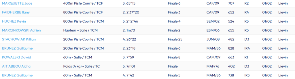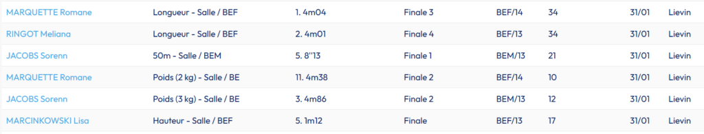 La veille et toujours à Liévin nous avions les benjamins et benjamines pour leur dernière journée qualificative pour le championnat départemental indoor. Là aussi beaucoup de satisfactions avec des records personnels pour Lisa Marcinkowski sur 50 m haies en 9″30, Romane Marquette en longueur 4m04 et sur 50 m en 7″79 , Meliana Ringot avec 4m01 en longueur et 7″86 sur 50 m (et 101 points au triathlon) et enfin le benjamin Adam Ammour sur 1000 m avec 3’39″19. Que de belles choses auxquelles a essayé de se mêler Sorenn Jacobs qui reste tout près de ses performances de décembre sans toutefois faire mieux (partie remise)