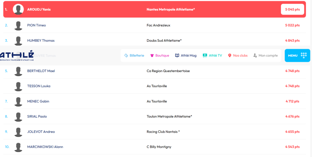 Et elle marche dans les pas d’un certain Alann Marcinkowski, cadet, plusieurs fois champions l’an dernier, et qui a dominé ce week-end les qualificatifs de l’Heptathlon (7 épreuves) au niveau régional. Et vous savez quoi? et bien il pointe à la 10ème place nationale au bilan avec 4543 points réussis contre 5045 points pour le nantais Aroud et à exactement 300 points du podium national tenu pat Humbey du doubs sud athlétisme.
