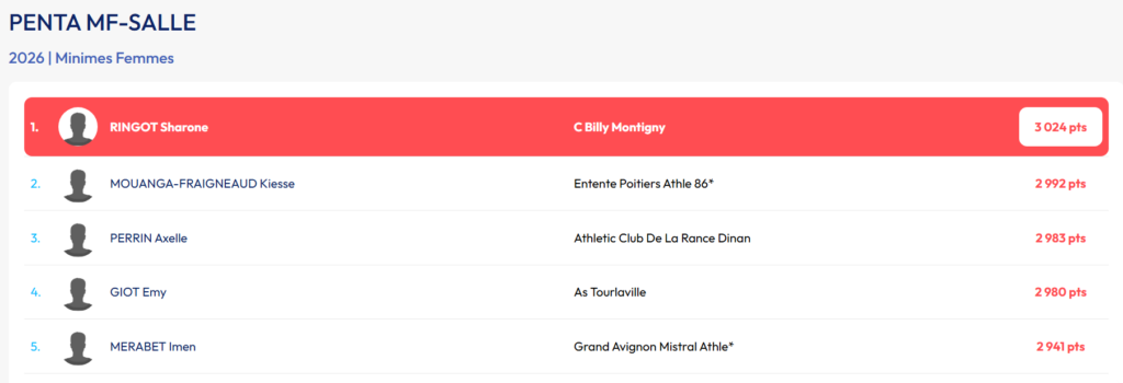 En signant la Meilleure Performance Française de l’année en heptathlon(2026 – donc de la saison hivernale en cours) Sharone a fait ce qu’on attendait pas vraiment, parce que ce qui était visé cet hiver était le titre départemental et un podium régional. Mais en réalisant ce total de 3024 points elle gagne non seulement la compétition mais avec ses quatre records personnels sur la journée elle s’empare de cette première place nationale. Ceci n’était jamais arrivé pour le club Billysien et c’est à noter ! Bien sûr la saison va se poursuivre en janvier et février, avec d’autres concurrentes qui vont vouloir venir faire mieux mais Sharone aura déjà marqué son nom là où il fallait et elle défendra cette place avec toute l’obstination qu’on lui connait.